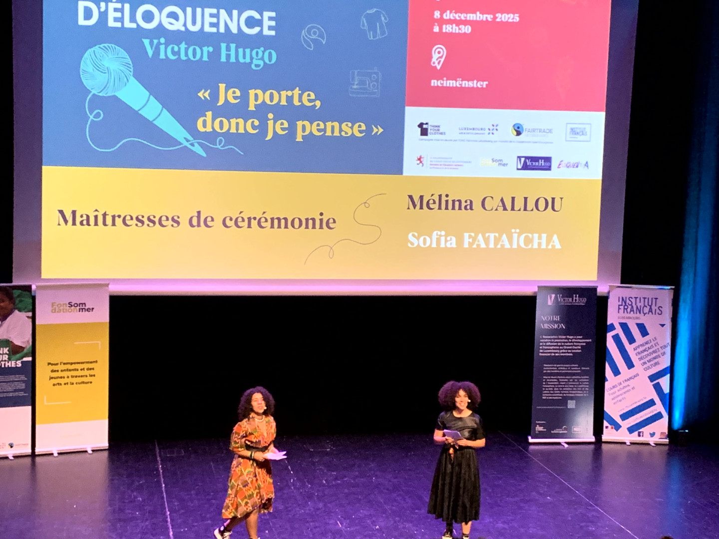 Den 28. November, trotz Prüfungszäit, hunn si an der Abei Neumünster virun engem grousse Publikum, hir Texter zum Thema 'Fair Fashion' virgedroen. Niewt dem Lycée Robert-Schuman waren och nach folgend Schoulen present: den Nordstad Lycée, de Lycée Vauban, d'Ecole Internationale vun Mondorf, de Lënster Lycée an d'Ecole privée Fieldgen. Vun all Schoul si SchülerInnen a binômes opgetrueden. D'Konkurrenz war grouss: verschidde Presentatiounen hu carrement un Ted-Talks erënnert, mat ganz prezisem Timing an enger reegelrechter Choreographie.